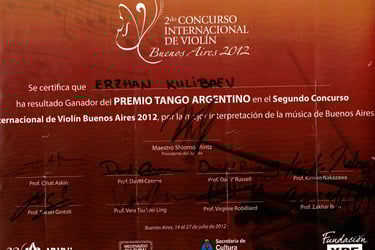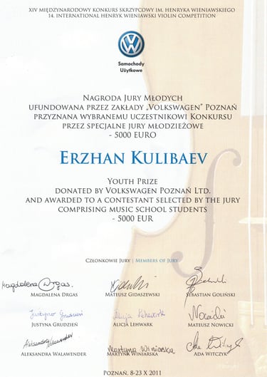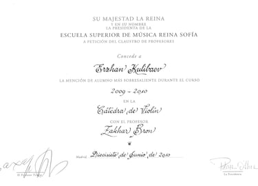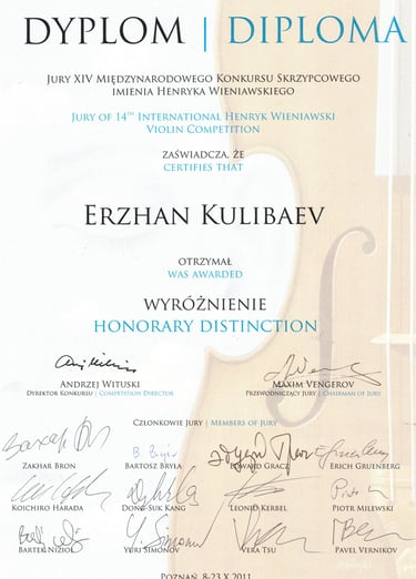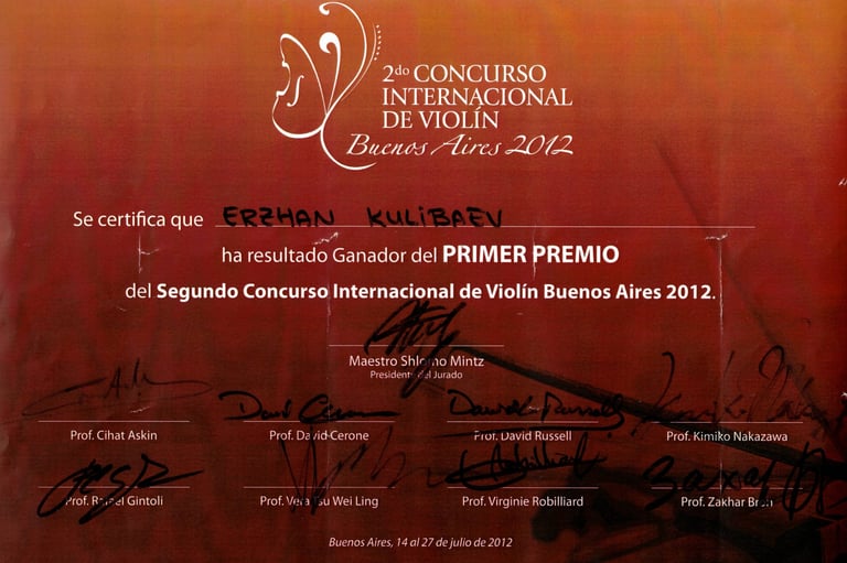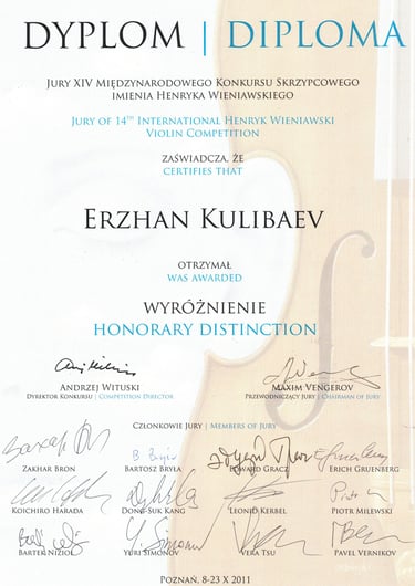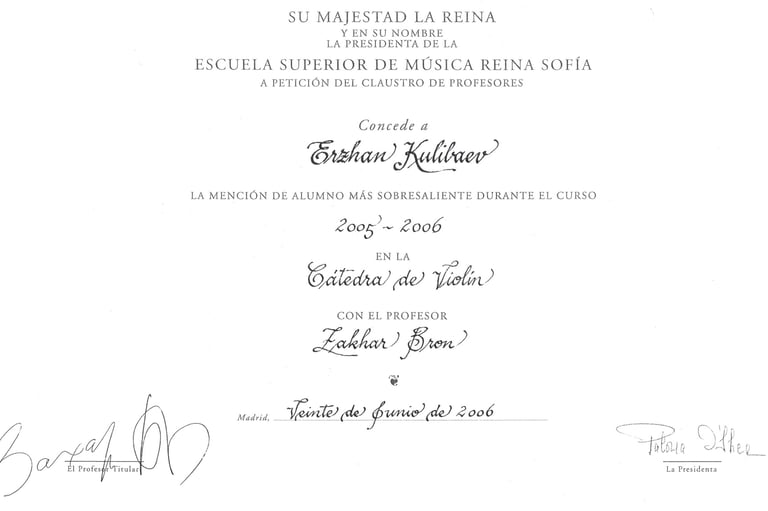 Graduado en la Escuela Central del Conservatorio de Moscú, Erzhan Kulibaev es uno de los pocos violinistas contemporáneos cuyo paradigma violinístico y pedagógico integra la tradición y enseñanzas de los dos violinistas más destacados del siglo XX: David Oistrakh y Jascha Heifetz. Durante muchos años, estudió con Zakhar Bron, discípulo de Igor Oistrakh en la Escuela Superior de Música Reina Sofía, y posteriormente perfeccionó su maestría con Pierre Amoyal, alumno de Jascha Heifetz, en la Universidad Mozarteum de Salzburgo.