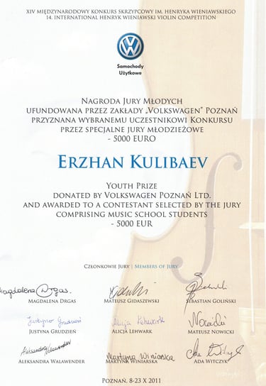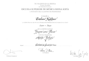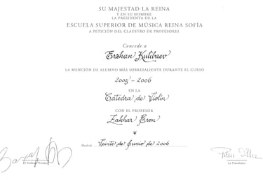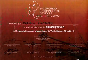 Ha sido galardonado en prestigiosos certámenes, entre los que se incluyen el Henryk Wieniawski Competition de Poznan, el George Enescu Competition en Bucarest, el Primer Premio y Premio Tango en el Concurso Internacional de Buenos Aires, el premio “Washington Award”, el Manhattan International Music Competition de Nueva York y el Berliner International Music Competition. En los años 2006 y 2010 fue distinguido como el alumno más sobresaliente de la cátedra de Zakhar Bron, y en 2011 como integrante del grupo de música de cámara más destacado, recibiendo en las tres ocasiones el diploma otorgado por Su Majestad la Reina Doña Sofía.
